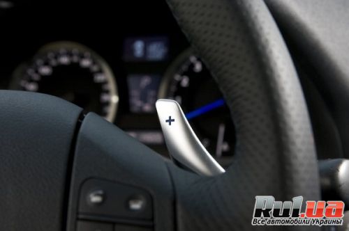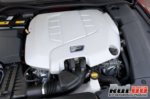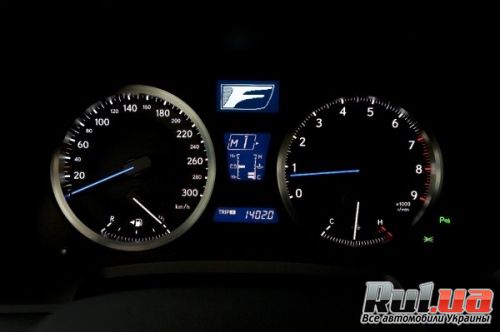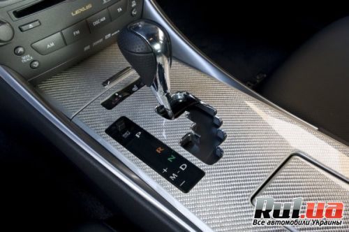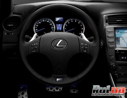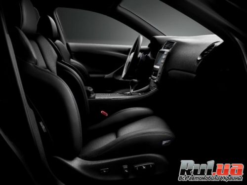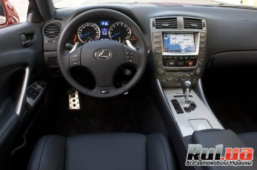 Внутри отличий от обычного Lexus IS гораздо меньше, нежели снаружи: руль другой формы, украшен логотипом F, более цепкие кресла, накладки на педали, комбинированная алюминиево-карбоновая отделка. На панели появился датчик температуры масла и shift lamp – лампа загорается при достижении двигателем максимальных оборотов.